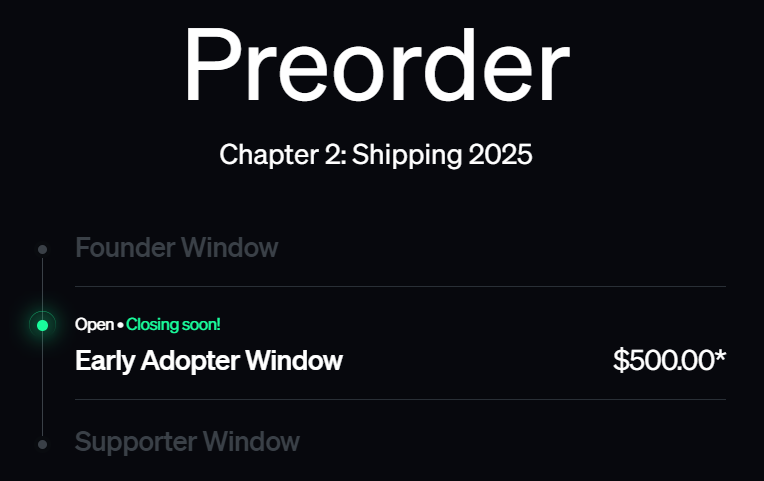 We are expecting this product will ship in the first half of 2025. This date is an estimate, and is subject to change. At the time of shipping, we will collect your shipping address and you will be responsible for taxes, shipping and fees.